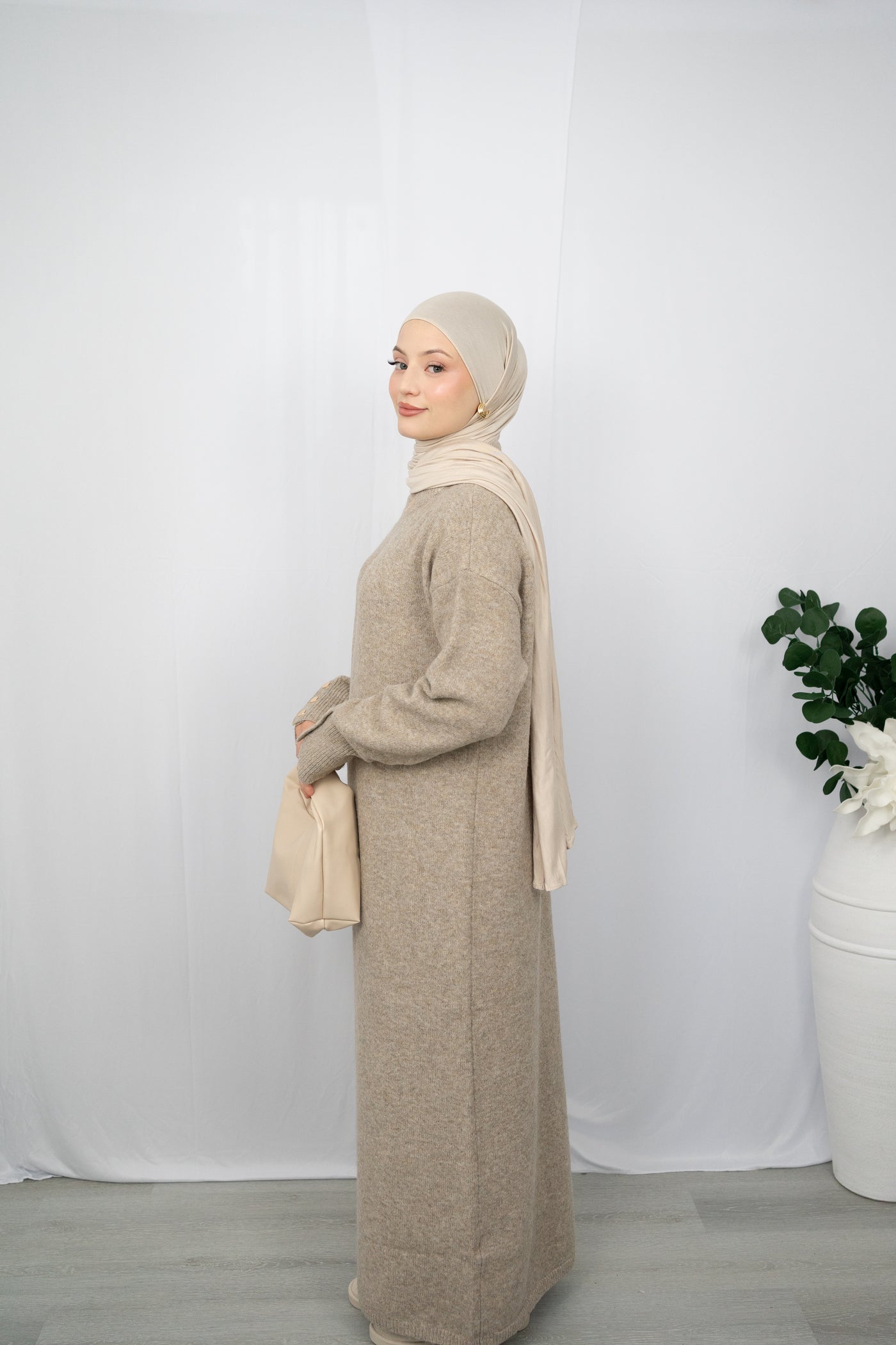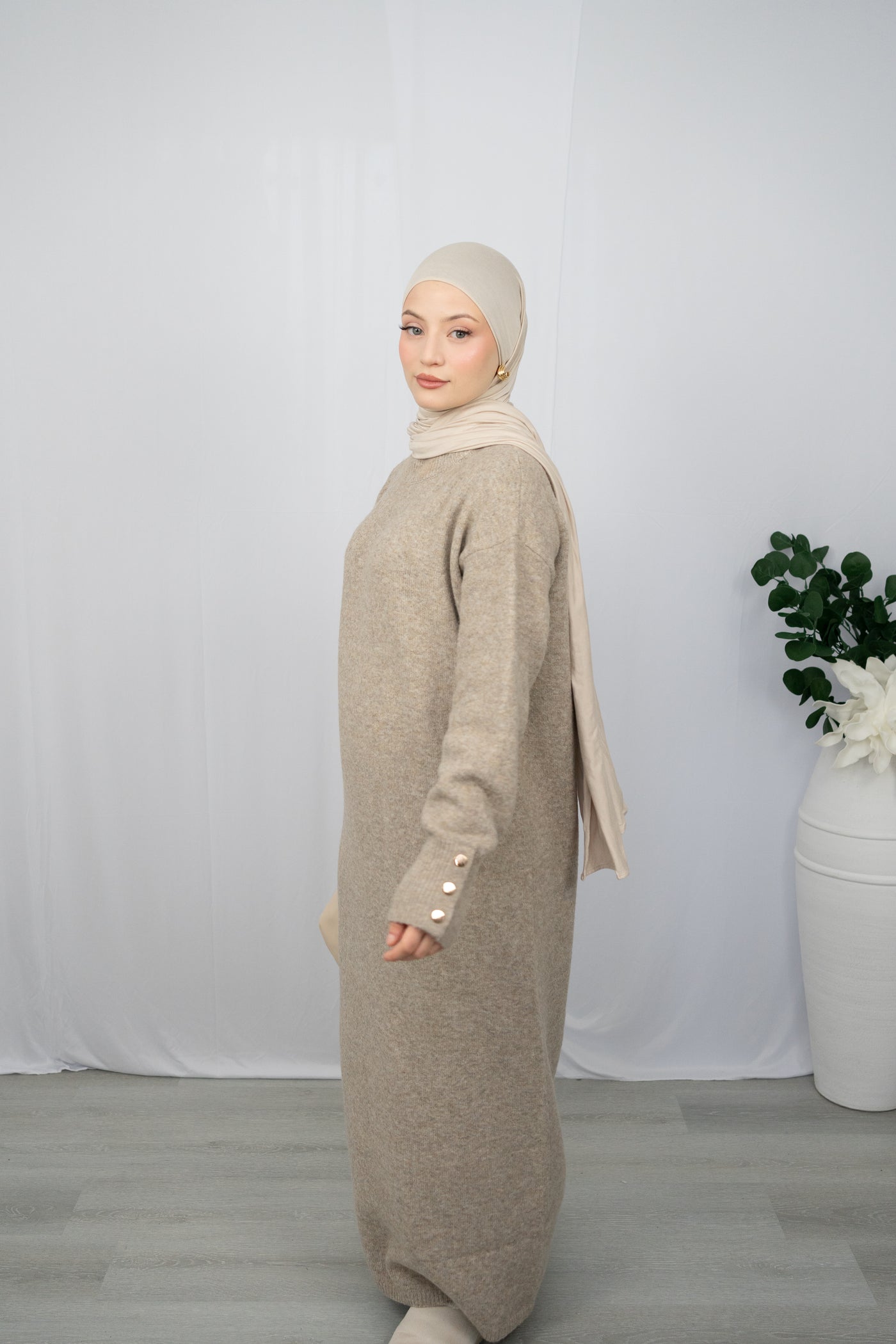 NAILA KLEID IN TAUPE MIT SCHÖNEN GOLDKNOPFDETAILS AN DEN ÄRMELN